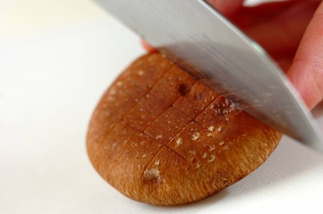 シイタケは軸を切り落とし、汚れを拭き取る。笠は格子に切り込みを入れる。