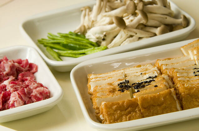 厚揚げは縦半分に切り、横に5mm幅くらいに切る。シメジは石づきを取って小房に分ける。牛肉は細かく切る。ピ-マンも細切りにする。