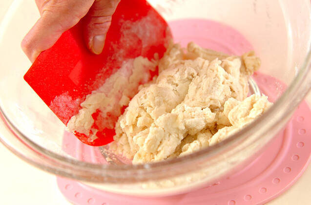 ボウルに強力粉を入れ、インスタントドライイースト、砂糖を真ん中におく。塩をはしにおき、ハチミツ、温めた水85~95mlをかけ、カードでひとまとまりになるまで混ぜる。
