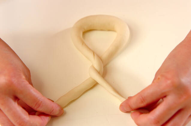 成形する。6等分して丸めなおし、ドッグ型にしたあと、それぞれ約40cmの長さに伸ばしていく(この時、両端を細めに伸ばしていく)。両端をクロスさせ、プレッツェルの形を作りクッキングシートの上に置いていく。