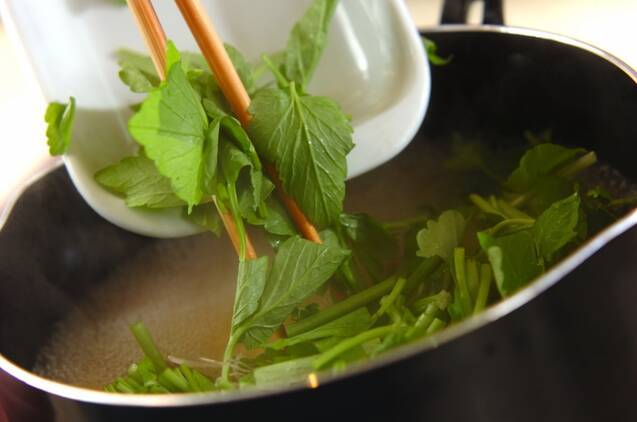 山芋を途中で返しながら2分煮て、最後にセリを加える。再び煮たったら塩で味を調え、器に注ぎ分ける。