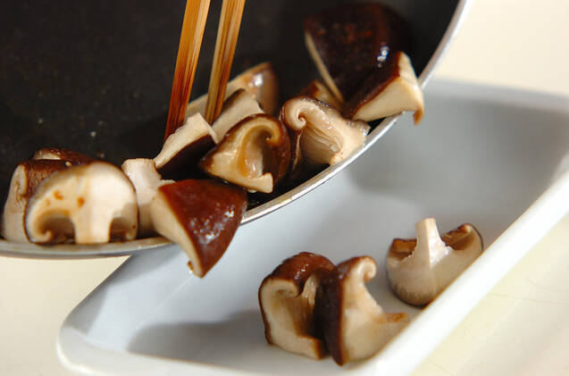 フライパンにシイタケ、酒、塩を入れて強火にかけ、しんなりしたらいったん取り出し、粗熱を取る。