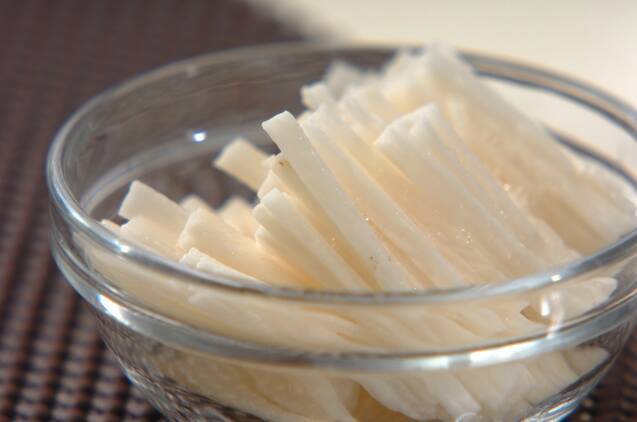 長芋は皮をむき、せん切りにする。<ソース>の材料を混ぜ合わせる。