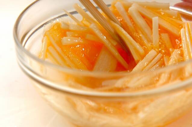卵を割りほぐし、きび砂糖と塩を入れて混ぜ合わせる。さらに長芋を入れ、混ぜる。