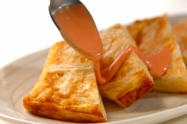 食べやすい大きさに切り、器に盛って<ソース>をかけ、青のりを振る。