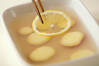 サツマイモは面取りをして、サッと水洗いし、耐熱容器にヒタヒタの水と塩少々を振りラップをかけ、電子レンジで2分加熱しサッと水洗いする。電子レンジは600Wを使用しています。