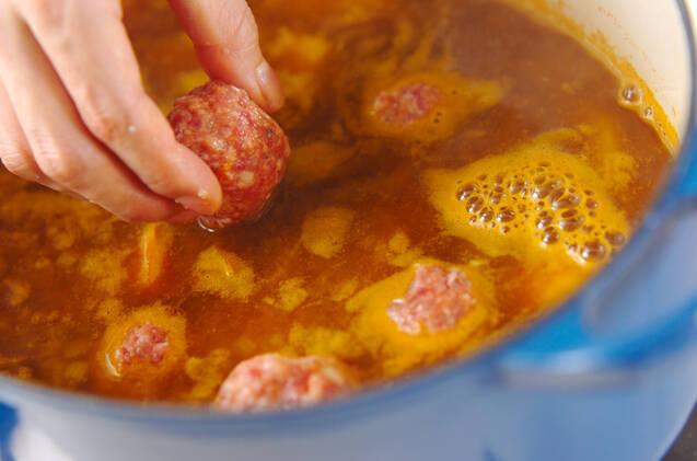 <合わせ調味料>を加えて更に10分煮、<ミートボール>を小さめのひとくち大に丸めて加え、ミートボールの表面が固まったら、蓋をして弱火で5~6分煮込む。
