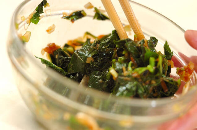 モロヘイヤ、ショウガ、白ネギ、しょうゆ、ゴマ油、豆板醤をよく混ぜる。