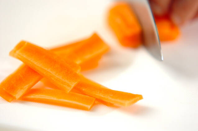ニンジンは皮をむき、短冊切りにする。