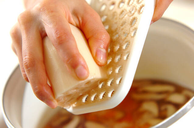 レンコンの水気をきり、(1)の鍋にすりおろしながら加える。少しトロミがついてきたら、塩コショウで味を調える。刻みネギを加え、ひと混ぜして器に注ぎ分ける。