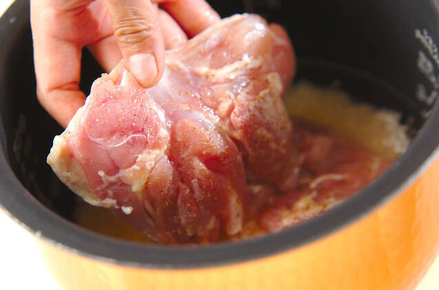炊飯器に洗ったお米と塩、しょうゆ、通常に炊飯する時の量の水を加え混ぜ、鶏もも肉とショウガを上にのせ、スイッチを入れる。