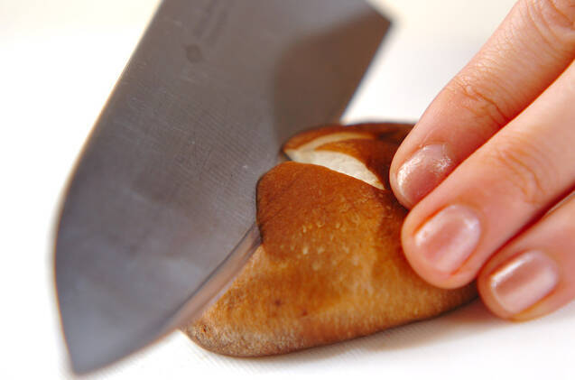 シイタケは石づきを切り落とし、汚れを拭き取る。軸と笠を切り離し、笠の表面に放射状に浅く切り込みを入れる。
