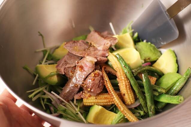 (2)の牛肉は一口大に切る。ボウルに<A>を入れ混ぜ、切った牛肉、ベビーコーン、インゲンを入れさっと和える。