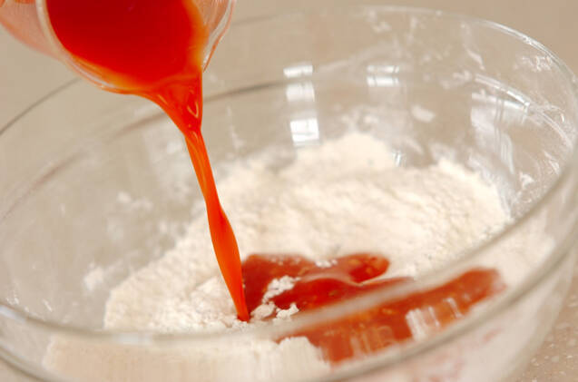 ボウルに強力粉、砂糖、インスタントドライイースト、オレガノを入れてゴムベラでよく混ぜる。塩を加えて再び混ぜ、トマトジュースを注ぐ。