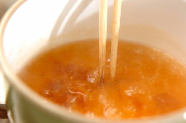 小鍋によく混ぜ合わせた<だし溶き片栗>の材料を入れて中火で熱し、混ぜながらトロミをつける。火を止め、<梅ダレ>を加えてよく混ぜ合わせ、鍋底を氷水につけて冷やす。