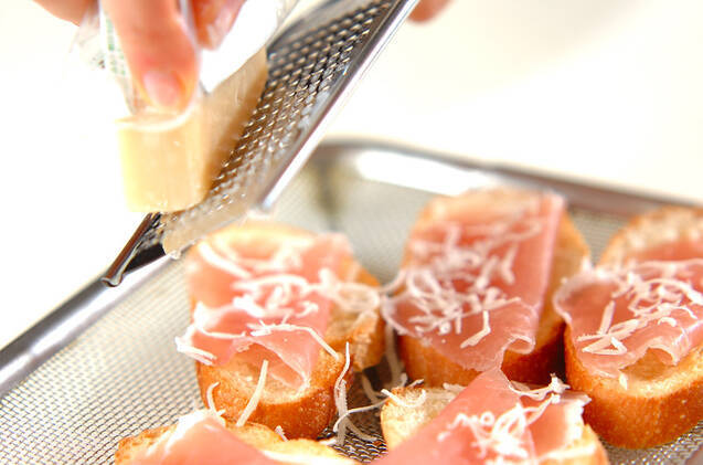(1)の上に生ハムをのせ、パルメザンチーズを削りながらかけ、粗びき黒コショウを振る。セルフィーユを飾り、器に盛る。