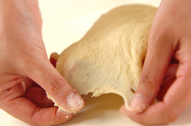 生地がまとまってきたら、台にたたきつけるようにしながらこね、生地を引っ張ってみても切れず薄くのびるようになるまで繰り返す。