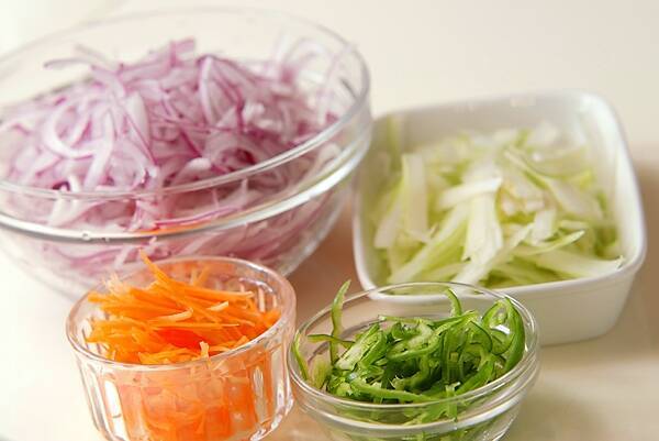紫玉ネギは縦半分に切る。縦に薄切りにしてサッと水洗いし、冷やしておく。