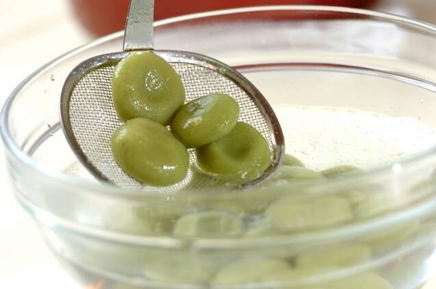 白玉を20個に丸め、少し中央を凹ませながら熱湯に入れ、浮いてきたらそのまま1分ゆで、冷水に取る。