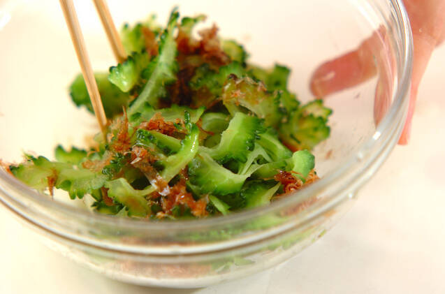 塩を入れたたっぷりの熱湯でゴーヤを1~2分ゆで、ザルに上げて冷水に取る。粗熱が取れたら水気を絞り、<合わせおかか>のボウルに入れてよく和え、器に盛る。