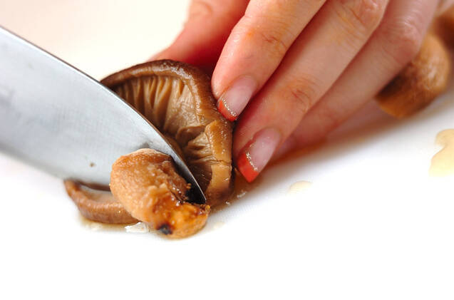 シイタケはぬるま湯につけて柔らかくもどし、軸を落とす。もどし汁は残しておく(分量が足りない場合は分量外のだし汁をたして下さい)。