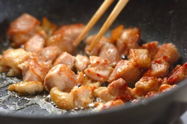 フライパンにサラダ油とバター10gを入れて中火にかけ、鶏もも肉を入れ、色が白っぽくなるまで炒め、玉ネギを加える。