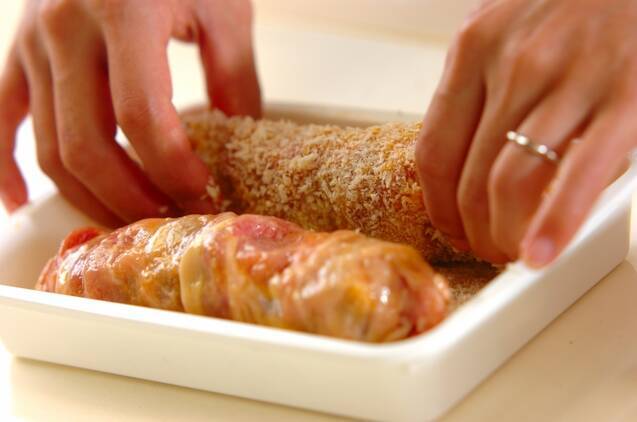 (1)に<衣>の小麦粉を薄くからめ、溶き卵をくぐらせてパン粉をつける。