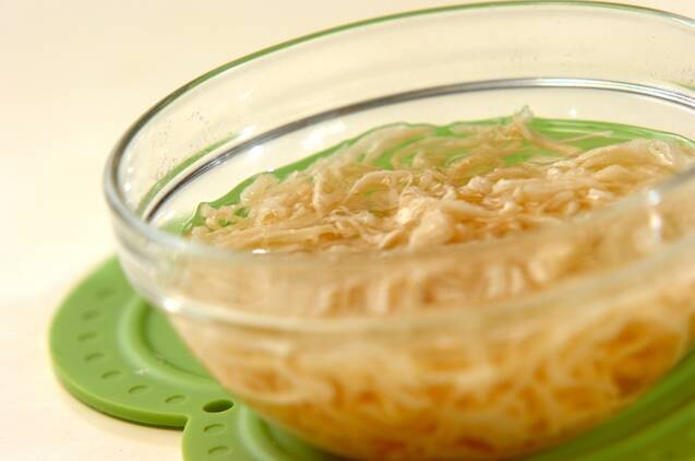 切干し大根はサッと洗い、たっぷりの水に10分つけて水気を絞り、長い場合はザク切りにする。