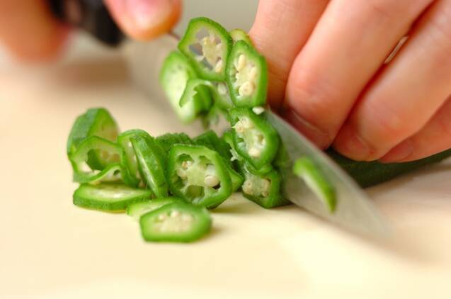 オクラは塩が付いたまま熱湯で30秒ほどゆでてザルに上げ、粗熱が取れたら薄い輪切りにする。オクラと明太子を混ぜ合わせる。
