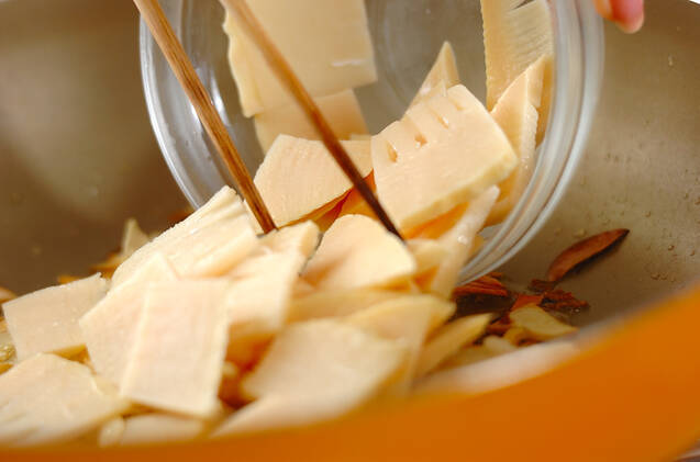 フライパンにオリーブ油、ニンニク、ショウガを入れて弱めの中火にかける。香りが立ってきたら新水煮タケノコ、ニンジン、ウド、刻み赤唐辛子を炒め合わせる。<調味料>を加えてひと混ぜし、ゆで上がったスパゲティー、シラス干し、スパゲティーのゆで汁を加え、強火にして手早く炒め合わせ、塩コショウで味を調える。