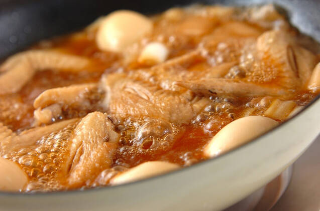 ゆで卵、<調味料>を加え、中火で煮汁が1/3量くらいになるまで、時々鶏を返しながら煮詰める。器に盛り、グリーンアスパラを添える。