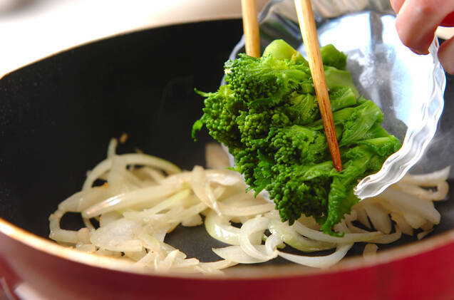1の菜の花、2の鶏肉を加え、<調味料>を加えて温め、器に盛る。