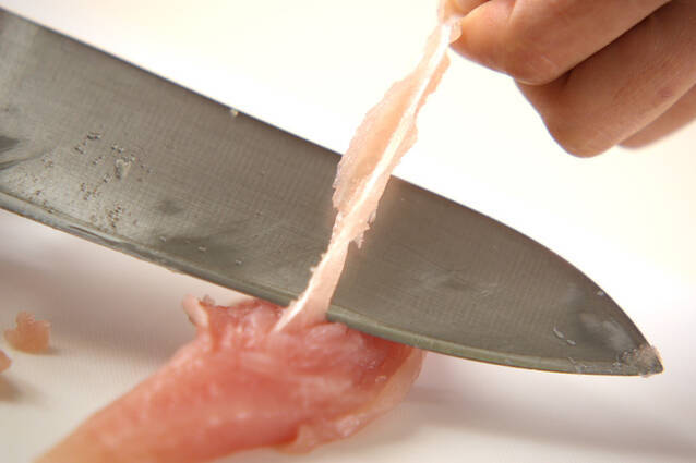 鶏ささ身は筋を引き、斜め切りにする。