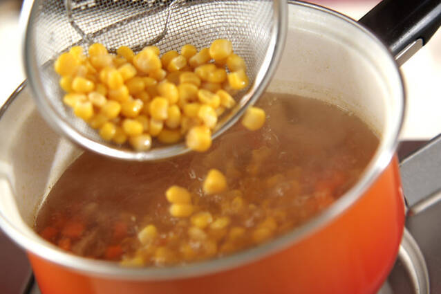 鍋に<スープ>の材料を入れて強火にかけ、煮立ったら鶏ささ身、ニンジンを加え、再び煮立ったら水煮コーンを加えて2~3分煮る。