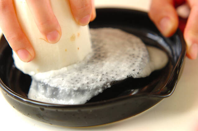 長芋は皮をむき、すりおろしてボウルに入れる。