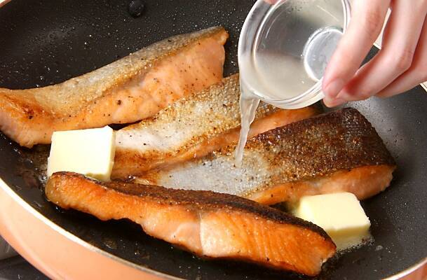 中火で熱したフライパンに、バターとレモン汁、しょうゆを加えて手早く混ぜ合わせ、2のサーモンにかける。