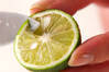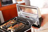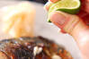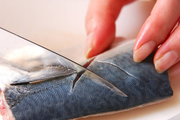 サバは身の厚い部分に切り込みを入れ、両面に塩を振る。<ポイント>手に塩を持ち、20~30cm位上で指の隙間から塩を落としながら、裏表全体にまんべんなく振り掛け、10分置く。(『振り塩をする』といいます)