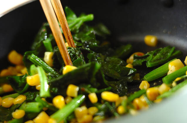 ホウレン草は根元を切り落とし、長さ2cmに切る。フライパンにバター5gを溶かし、コーンと共に炒め合わせ、塩コショウで味を調える。