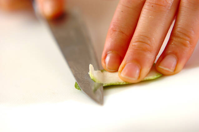 ユズ皮またはスダチ皮は、苦みがあるので裏側の白い部分を削ぎ落とし、細切りにして水に放ち、切り口をサッと洗って水気をきる。