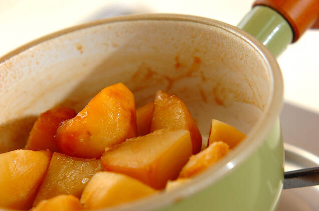煮汁が少なくなったら、鍋をゆすって煮汁をジャガイモにからめる。器に盛ってユズまたはスダチの皮をのせる。