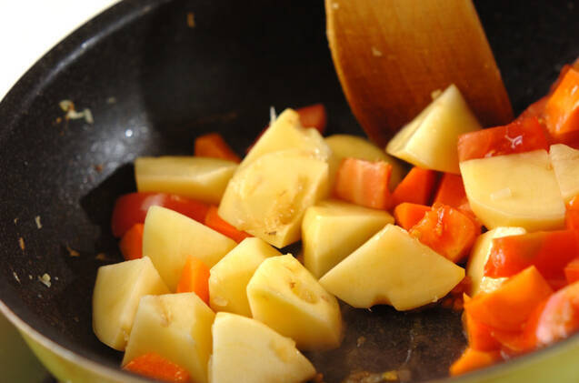 (1)のフライパンにサラダ油大さじ1/2を中火で熱し、ニンジン、ジャガイモ、トマトを加えて炒め合わせ、煮込み鍋に移す。