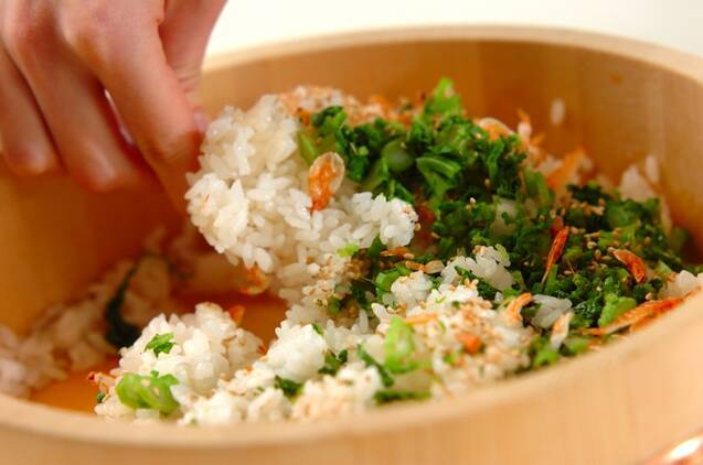 ご飯が炊き上がったら昆布を取り出し、飯台に作り置き甘酢大さじ1を入れて全体にぬるように広げ、ご飯をあける。残りの甘酢を全体にまわしかけて切るように混ぜ、人肌位の温かさまで冷ます。冷めたら小口切りにした菜の花、干し桜エビ、白ゴマを混ぜ合わせる。