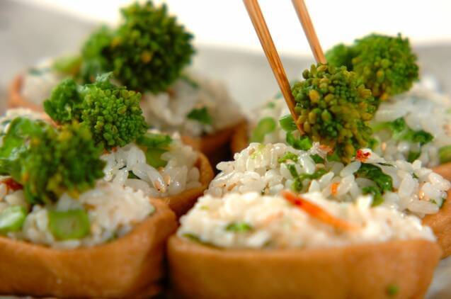 軽く汁気をきった油揚げを内側に折り込み、(3)を10~12等分に分けて軽く握って詰める。形を整え、飾り用に残しておいた菜の花をのせて器に盛る。