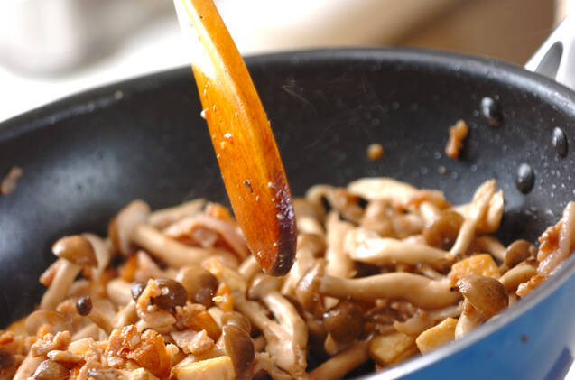中華鍋にサラダ油を強火で熱し、厚揚げがカリカリ状態になるまで炒め、干しエビ、シメジを加えて炒める。更に豚肉を加えて白っぽくなるまで炒める。