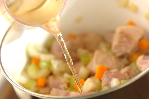 鍋にニンニクとオリーブ油を入れて加熱し、ニンニクの香りがたってきたら準備しておいた野菜を加えて炒める。野菜がしんなりしてきたら、準備しておいた豚肩肉を加えてさらに炒め、豚肩肉の色が変わってきたら白ワインを加えてアルコール分を飛ばす。