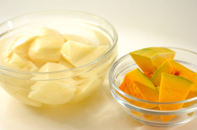 ジャガイモは皮をむいて1個を4~6つに切り、水に放つ。