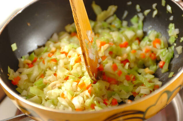 <野菜の揚げ団子>を作る。分量外のサラダ油で玉ネギ、キャベツ、ニンジン、カシューナッツを炒めて冷ます。ジャガイモ、カボチャはぬれたままラップで包み、電子レンジで竹串がスッと刺さるくらいまで2~3分加熱する。電子レンジは600Wを使用しています。揚げ油を170℃に熱する。