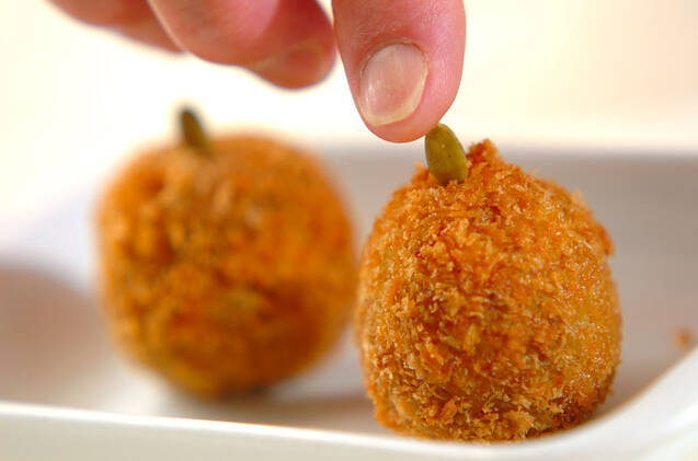 170℃に予熱した揚げ油に入れて、色よくサクッと揚げる。粗熱が取れたら、パンプキンシードを刺して器に盛り、<ソース>の材料を混ぜ合わせて添える。