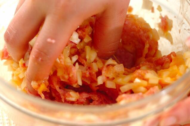 <肉団子>を作る。ボウルに豚ひき肉と塩コショウ、ナツメグを入れ、よく練る。玉ネギ、パン粉、溶き卵を加え、さらに練る。10等分にして丸め、薄く小麦粉をまぶす。