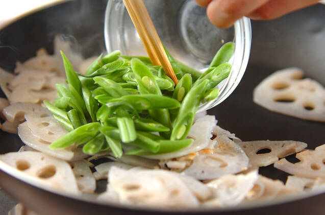 サヤインゲンを加えて炒め合わせ、さらに<調味料>の材料を加え、汁気がほとんどなくなるまで炒め合わせる。器に盛り、粉山椒を振る。